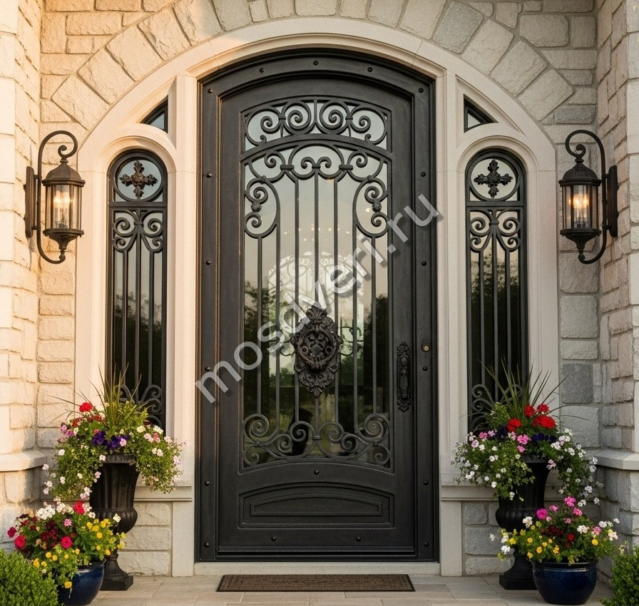 Большая входная дверь со стеклом и ковкой — совмещает стильный внешний вид и высокую надёжность.